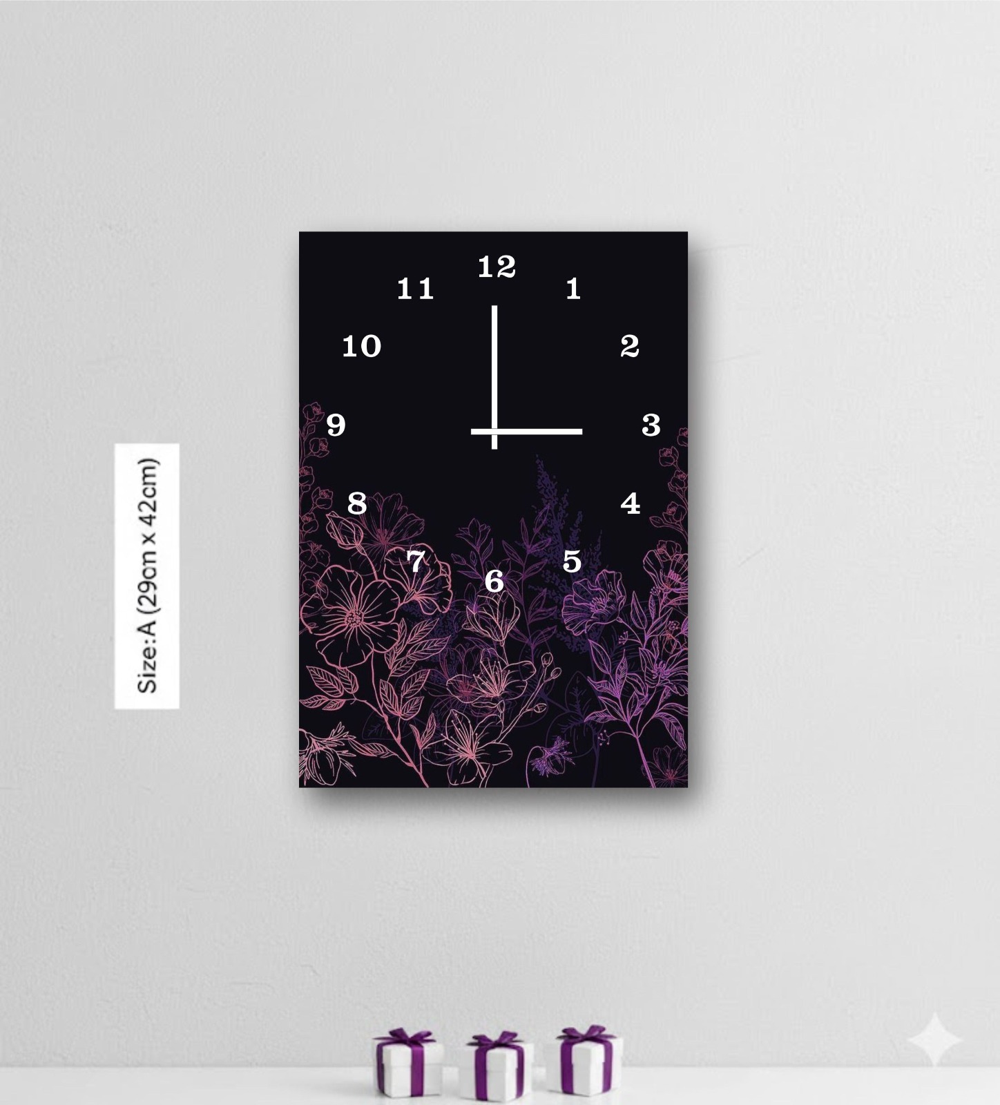 Contrast beauty boldly with the Floral Black Wall Clock, vivid flowers thriving on midnight canvas. Edgy for modern lofts or accent walls, it captivates with dramatic flair.